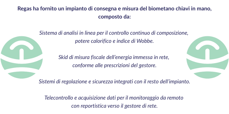 Regas progetta e realizza stazioni di immissione che integrano in un unico impianto misura fiscale di portata ed energia, analisi in continuo della qualità del gas, regolazione della pressione e odorizzazione.